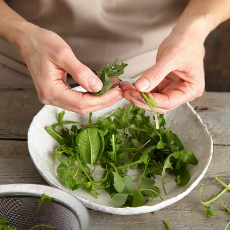 Die Wildkräuterblättchen falls nötig verlesen, abbrausen und mit einem Küchentuch oder mit Küchenpapier trocken tupfen.