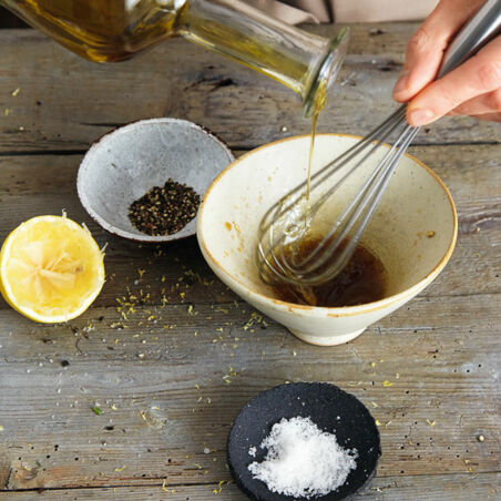 Aus Olivenöl, Zitronensaft und -schale, der Worcestersauce, Salz und Pfeffer ein cremiges, nicht zu würziges Dressing rühren.