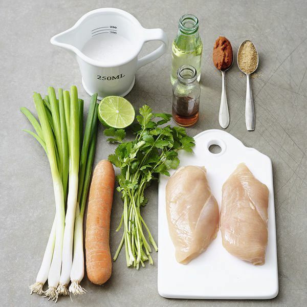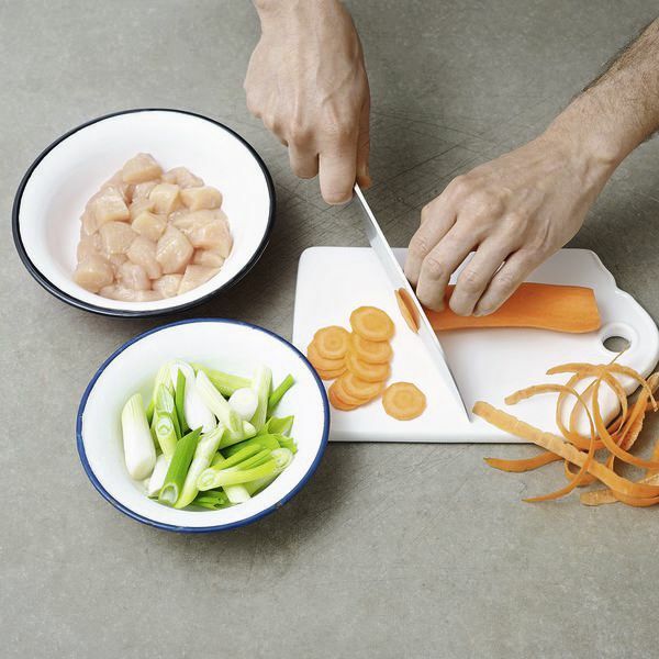 Zunächst das Hähnchenfilet abbrausen und mit Küchenpapier trocken tupfen, dann ca. 2 cm groß würfeln. Die Frühlingszwiebeln putzen, waschen und schräg in 3 cm lange Stücke schneiden. Die Möhre putzen, schälen und in dünne Scheiben schneiden.