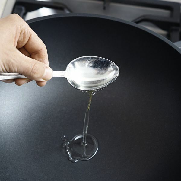 Erst den Wok erhitzen. Er hat die richtige Temperatur, wenn 2 - 3 Tropfen Wasser darin sofort zischend verdampfen. Dann 1 EL Öl hineingeben und darin erhitzen.