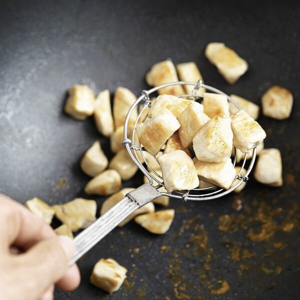 Nun die Hähnchenwürfel im heißen Öl in ca. 3 Min. bei starker Hitze anbraten und dabei wenden, bis sie hellbraun sind. Hähnchenwürfel aus dem Wok nehmen.