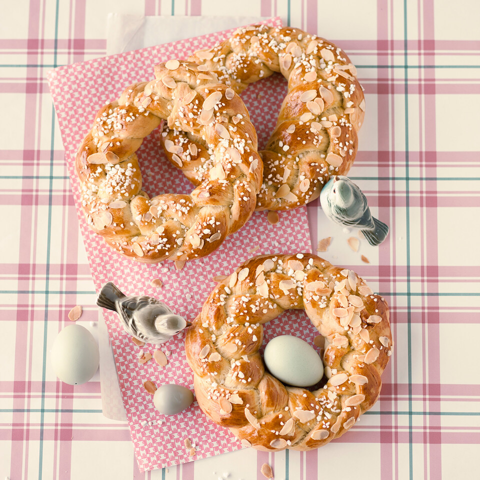 Den Backofen auf 180° vorheizen. Eigelb und Milch verquirlen und die Kränze damit bestreichen. Mit Mandelblättchen und Hagelzucker bestreuen. Im Ofen (Mitte) in 15 - 20 Min. goldgelb backen. Osterkränze vom Blech nehmen und auf einem Kuchengitter abkühlen lassen.
