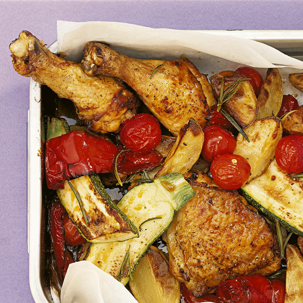 Aus dem Backofen schnell auf den Tisch: Hähnchenfleisch geschickt mit frischem Gemüse zu einem ausgewogenen Essen kombiniert.