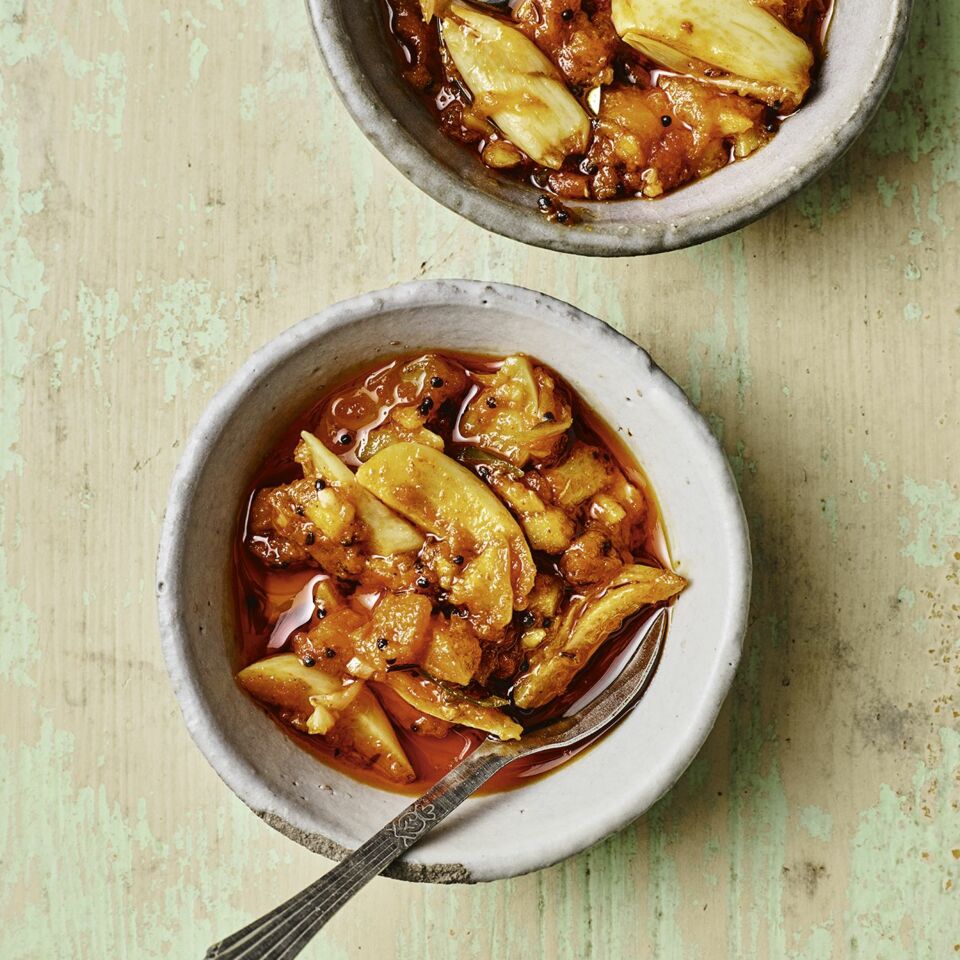 ⅓ TL Salz, Zucker und Essig hinzufügen. Mit Pfeffer abschmecken. Heiß in ein sauberes Schraubglas füllen. Vor dem Servieren 1 Tag durchziehen lassen. Hält sich mind. 4 Wochen im Kühlschrank. Passt sehr gut zu Dal.