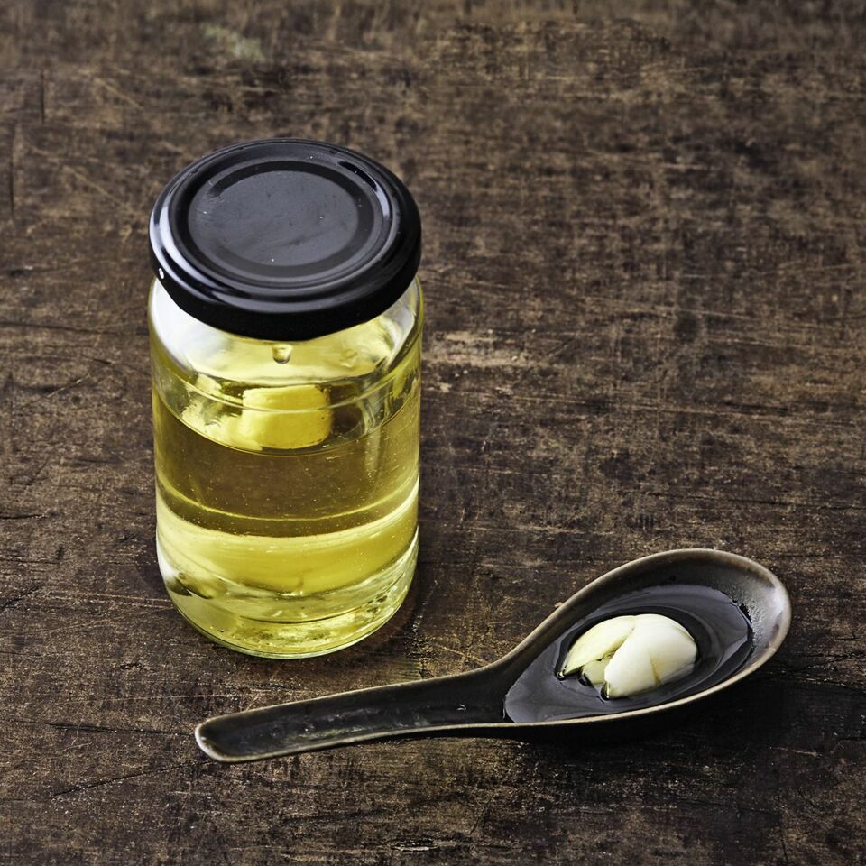 Knoblauch schälen und mit dem Messerrücken andrücken. Die Knoblauchzehen in ein sterilisiertes Schraubglas oder eine kleine Flasche geben und mit dem Öl auffüllen.