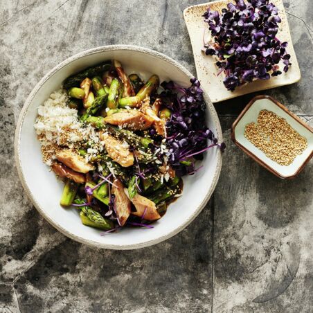 In unter 30 Minuten steht diese leckere Kombination aus grünem Spargel, Sprossen, Räucherforelle und Hoisinsauce auf dem Tisch. Perfekt für den Frühling.