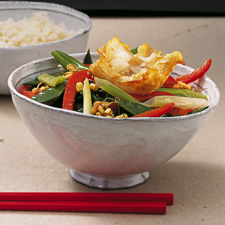 Gemüse waschen und putzen. Paprikaschote in Streifen, Frühlingszwiebeln in Stücke schneiden, Zuckerschoten halbieren. In einem Wok 2 EL Öl erhitzen. Paprikastreifen darin 2 Min. pfannenrühren, Zuckerschoten und Frühlingszwiebeln dazugeben, 2 Min. unter Wenden mitbraten. Sprossen unterheben, bei starker Hitze 1 Min. mitbraten. Mit Sojasauce, Salz und Pfeffer würzen.