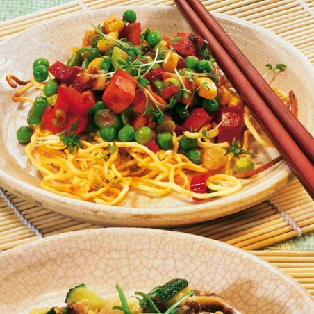 Das übrige Öl im Wok stark erhitzen. Paprika und Frühlingszwiebeln hineingeben, Knoblauch dazudrücken. Alles bei starker Hitze ca. 2 Min. pfannenrühren. Schinken, Erbsen und Mais dazugeben, alles 1 Min. braten. Würzsauce noch einmal durchrühren, in den Wok gießen. Alles unter ständigem Rühren 1 Min. kochen lassen, über die Nudeln geben. Die Kresse kalt abbrausen und über die Nudeln schneiden.