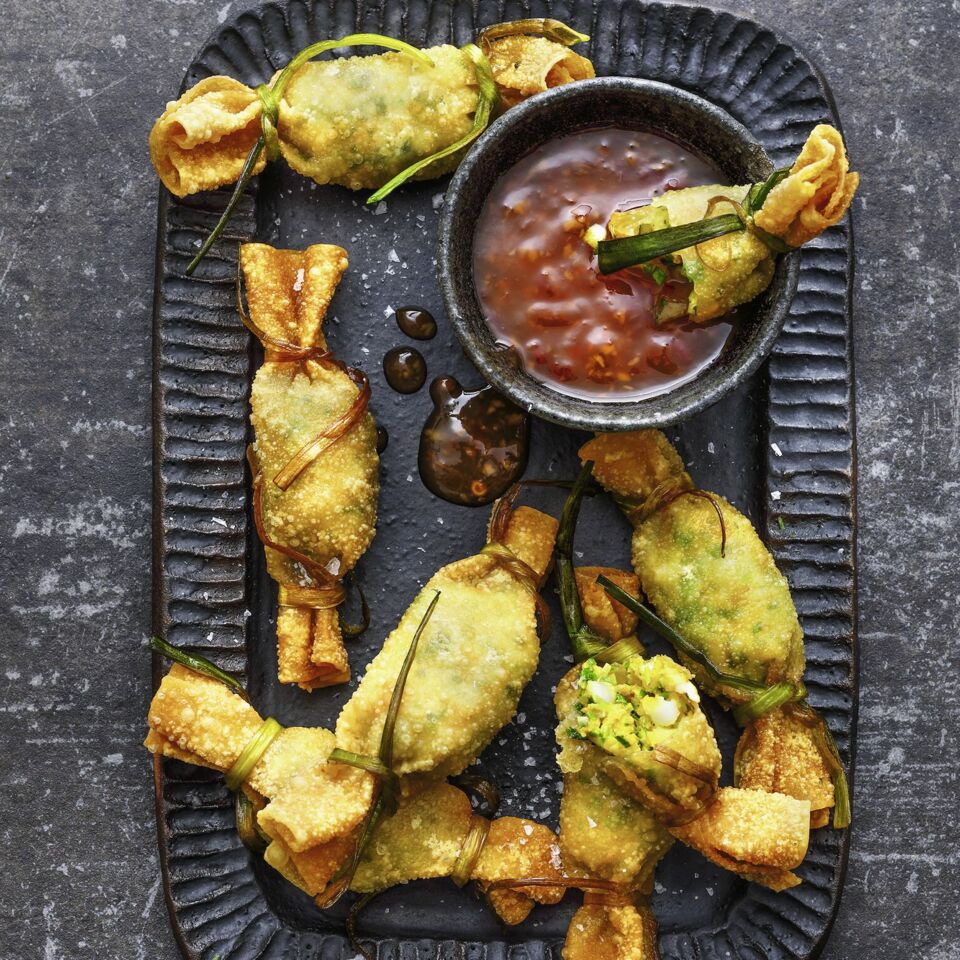 Diese knusprigen Bonbons bestehen aus frittierten Wan-Tan-Blättern und einer Füllung aus Fisch, Lauch und Gewürzen. Schmeckt toll mit einer süßen Chilisauce.