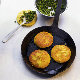 Reichlich Ghee oder Öl in einer beschichteten Pfanne erhitzen. Plätzchen reinlegen und von beiden Seiten in je etwa 5 Minuten knusprig braun braten. Sofort mit Chutney oder Tomaten-Raita servieren.
