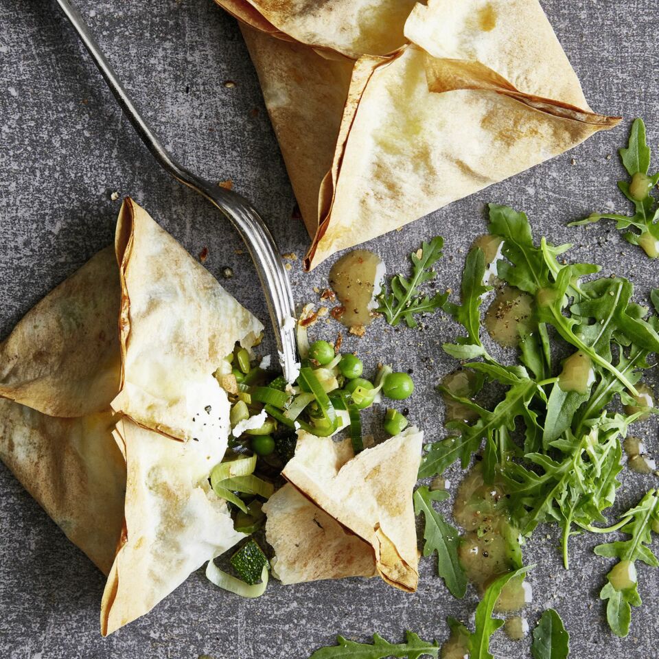 Außen knusprig und innen herrlich aromatisch kommen diese Teigtaschen aus dem Ofen. Als Gegenstück hier ein frischer Rucola-Salat mit Feigen-Dressing.