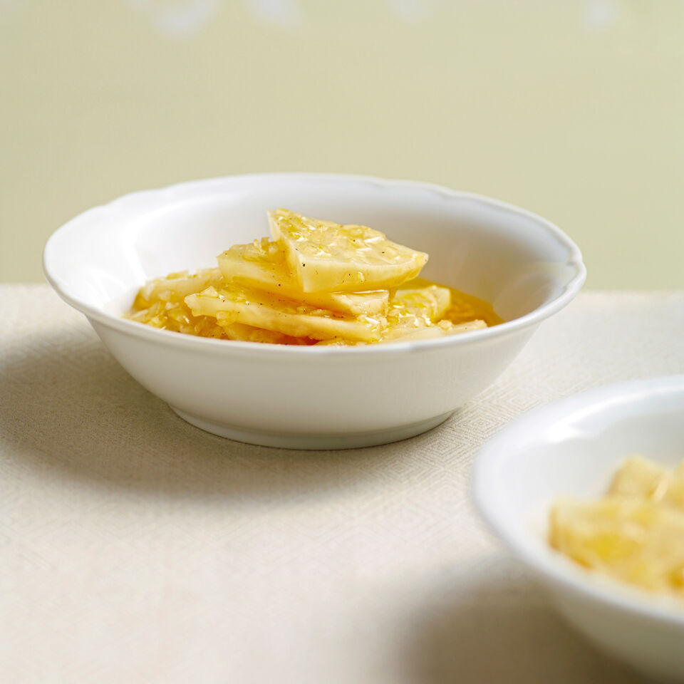 Den Sellerie aus dem Sud heben, 200 ml Sud abmessen. Die Sellerieviertel eventuell längs teilen, dann quer in ½ cm dicke Scheiben schneiden, in eine Schüssel geben. Die Zwiebel schälen, in feine Würfel schneiden und über den Sellerie streuen.