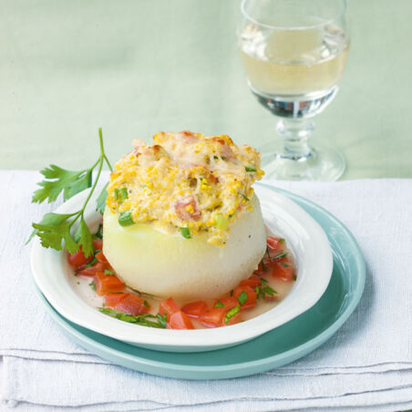 Ausgehöhlte Kohlrabi in einem Dämpfeinsatz über dem Dampf in 8-12 Min. bissfest garen. Tomaten schälen, halbieren, entkernen und klein würfeln. Ein Drittel davon beiseitelegen, Rest salzen und pfeffern. Ofen auf 200° (180° Umluft) vorheizen. Petersilie waschen, trocken tupfen und hacken. Hirse mit zwei Dritteln der Tomaten, Ricotta, Frühlingszwiebelgrün und Petersilie mischen, salzen und pfeffern. Kohlrabi damit füllen, in eine ofenfeste Form setzen und mit Käse bestreuen. Übrige Brühe mit restlichen Tomaten mischen und in die Form geben. Im Ofen (Mitte) 8-10 Min. überbacken.