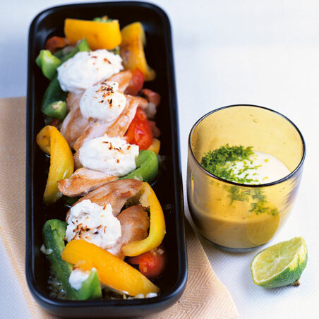 Das Gemüse in eine Auflaufform geben, die Brühe angießen. Das Fleisch obenauf verteilen, Kokoscreme in Klecksen darauf geben. Im Ofen (Mitte, Umluft 180°) ca. 25 Min. backen. Joghurt, Limettenschale und -saft verrühren. Mit Salz und Cayennepfeffer würzen, zum Auflauf reichen.