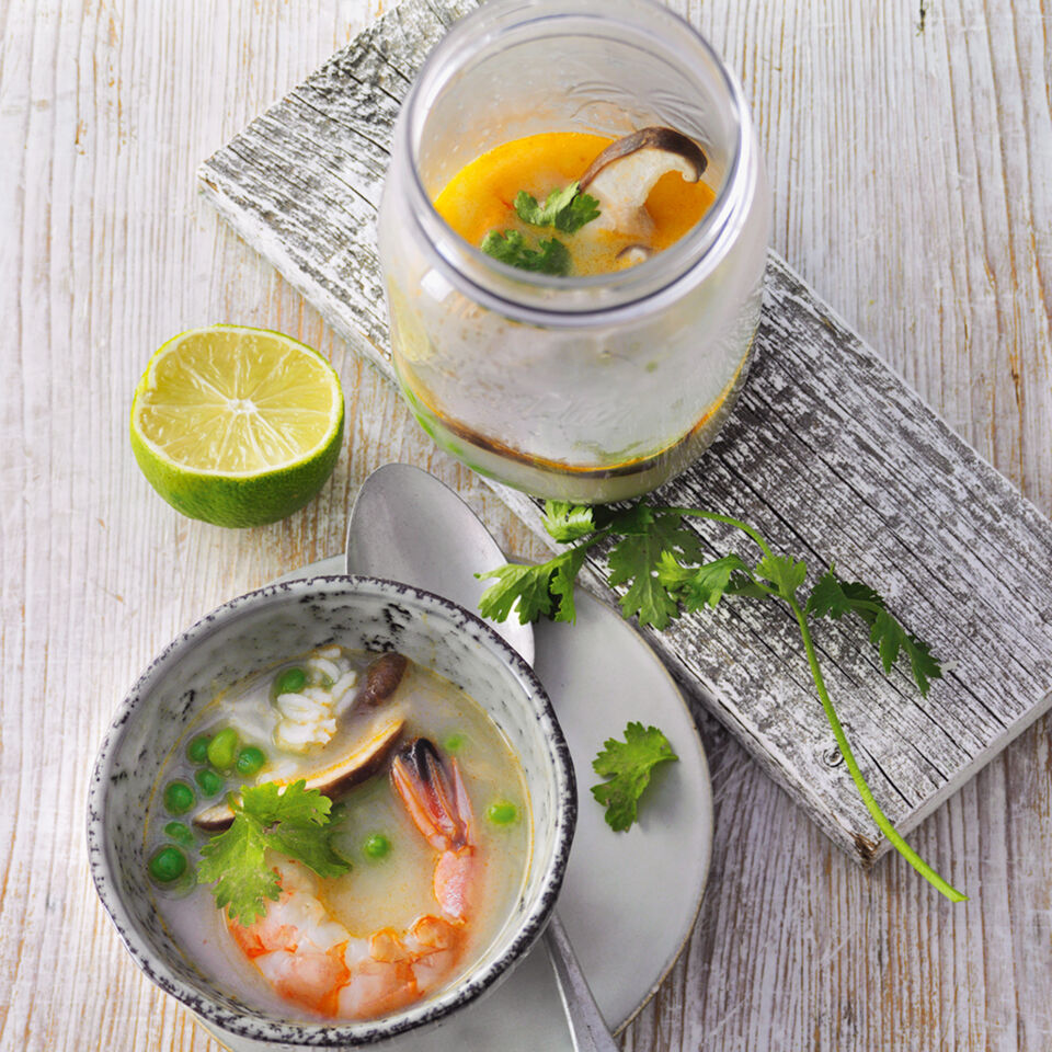 Curryscharf, superaromatisch und wunderbar belebend: thailändisches Löffelglück mit duftendem Basmati, Garnelen, würzigen Shiitake-Pilzen und knackigen Erbsen.