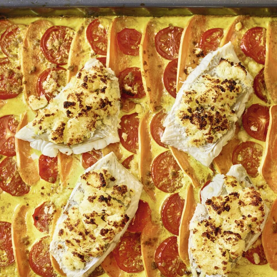 Der Lachs wird zusammen mit Süßkartoffeln, Kokosmilch, Tomaten und Gewürzen auf einem Blech zubereitet. Damit zählt dieses Gericht zu den One-Sheet-Pan-Gerichten.