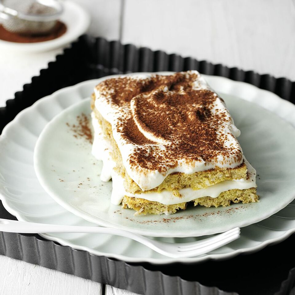 Auf zwei Teller je ein Biskuitteigstück legen. Die Biskuitböden mit der Hälfte des Espresso beträufeln. Die Hälfte der Mascarponecreme auf den Biskuitböden verteilen. Die zweiten Biskuitböden darauflegen und mit dem restlichen Espresso beträufeln. Die restliche Mascarponecreme darauf verteilen, glatt streichen und mit dem Kakaopulver bestäuben. Abgedeckt im Kühlschrank bis zu 2 Tage aufbewahren oder sofort servieren.
