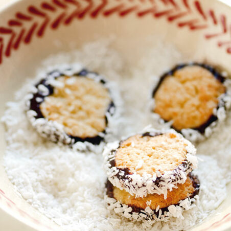 Eine Arbeitsfläche mit den restlichen Koksraspeln bestreuen. Den Teig darauf zu zwei Rollen (à ca. 3 cm Ø) formen. Jede Rolle in ca. 1 cm dicke Scheiben schneiden und diese auf das Blech legen. Nach Belieben die Teigscheiben noch gleichmäßig rund formen. Im Backofen (Mitte) ca. 8 Min. backen. Herausnehmen und auf einem Kuchengitter abkühlen lassen.