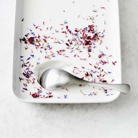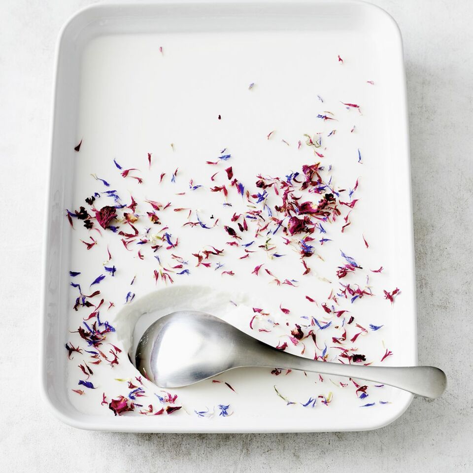 Einfaches veganes Dessert mit Kokosmilch, Limetten und getrockneten Blüten.