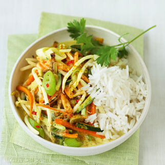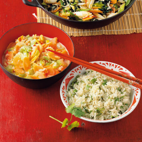 Den Koriander abbrausen, trockenschütteln, die Blättchen abzupfen und grob hacken. Den Reis abgießen, abtropfen lassen und mit dem Koriander vermischen. Mit dem Kokosgemüse anrichten.