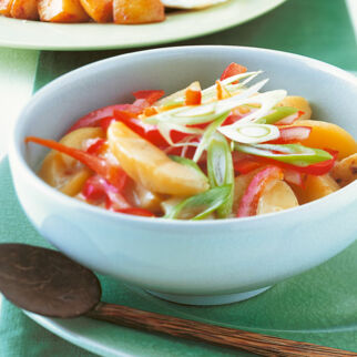 Inzwischen die Kokosmilch mit der Brühe zum Kochen bringen. Fleisch hineingeben, Topf vom Herd nehmen. Zugedeckt in 12-15 Min. gar ziehen lassen.