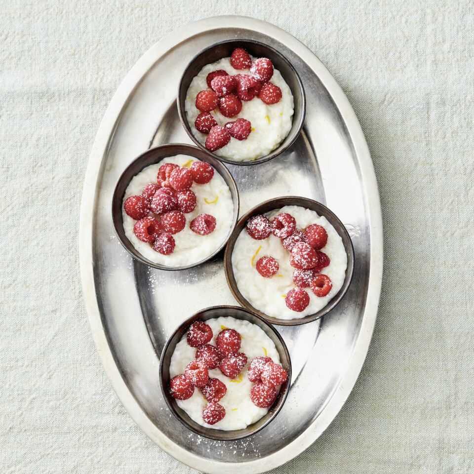 Himbeeren verlesen, kurz abbrausen und vorsichtig trocken tupfen. Den noch warmen Reis auf Desserttellern anrichten, mit Himbeeren garnieren und mit Puderzucker bestäuben.