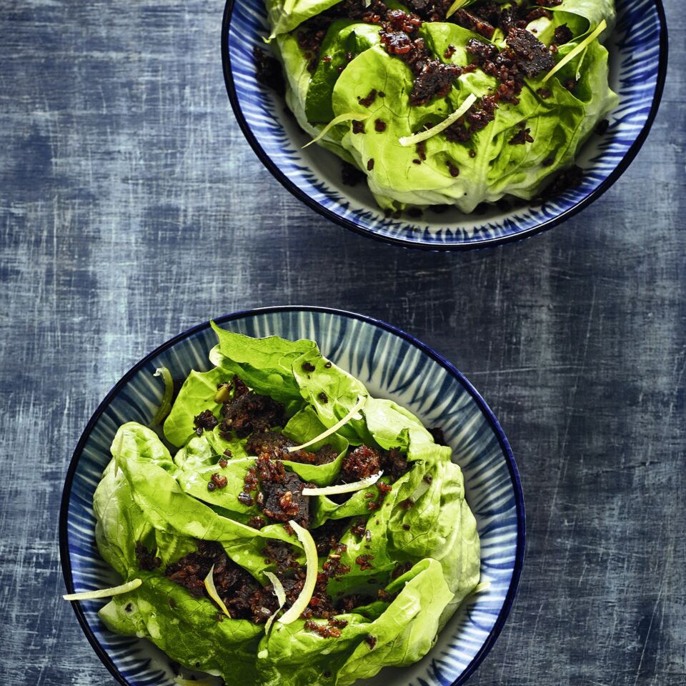 Anrichten: Die Salzzitronenstreifen unter den Salat mischen und diesen auf Portionsschüsseln oder (tiefe) Teller verteilen. Die Knusperbrösel darüberstreuen.