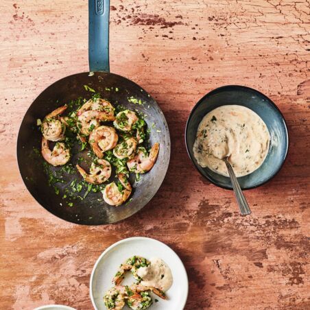 Herrliches Soulfood zum Feierabend: Garnelen mit Knoblauch und Harissa-Dip.