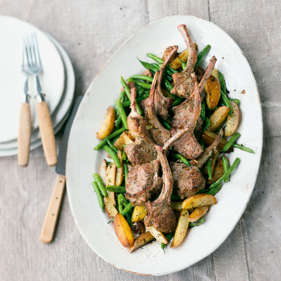 Die Koteletts abtropfen lassen, salzen, pfeffern und im Bratfett auf beiden Seiten je 1-2 Min. braten, herausnehmen. Bohnen darin 1 Min. anbraten. Kartoffeln und Lamm dazugeben und unter Rühren alles noch 1-2 Min. braten, abschmecken und sofort servieren.