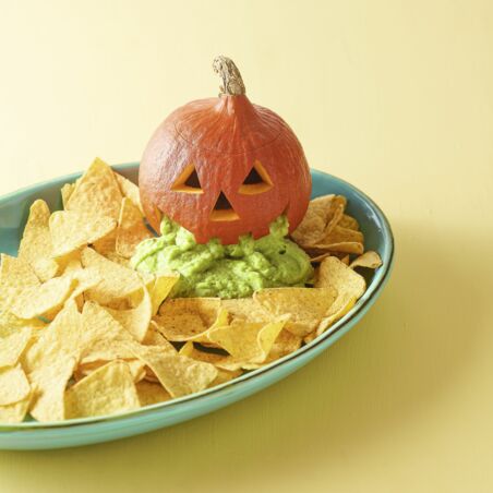 Den Kürbis waschen und trocken tupfen. Mit einem scharfen Messer vom Kürbis oben einen Deckel abschneiden. Den Kürbis mithilfe eines Esslöffels aushöhlen. Mit dem Messer Augen und Mund in die Schale schneiden. Kürbisgeist auf eine Platte setzen. Die Guacamole aus dem Kürbismund quellen lassen. Die Nachos ringsherum anrichten.