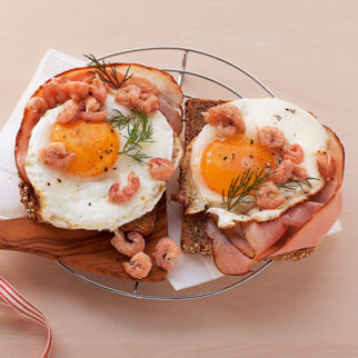 Die Eier mit etwas Salz und Pfeffer leicht verquirlen, aber nicht schaumig schlagen. Die restliche Butter in einer Pfanne erhitzen. Die Zwiebelwürfel darin bei schwacher bis mittlerer Hitze glasig dünsten. Die Krabben dazugeben, kurz in der Pfanne schwenken. Die Eier darübergießen und unter sanftem Rühren cremig stocken lassen.