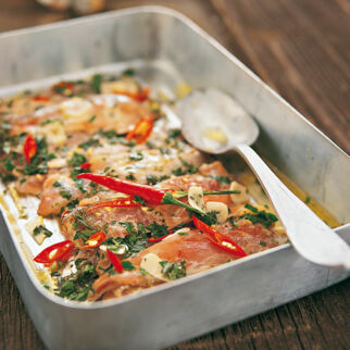Die Kräuter waschen und trockenschütteln, den Knoblauch schälen. Beides fein hacken und mit Olivenöl, Salz und Pfeffer vermischen. Die Sardellen gut in der Kräuter-Öl-Mischung wenden und 1 Std. marinieren.