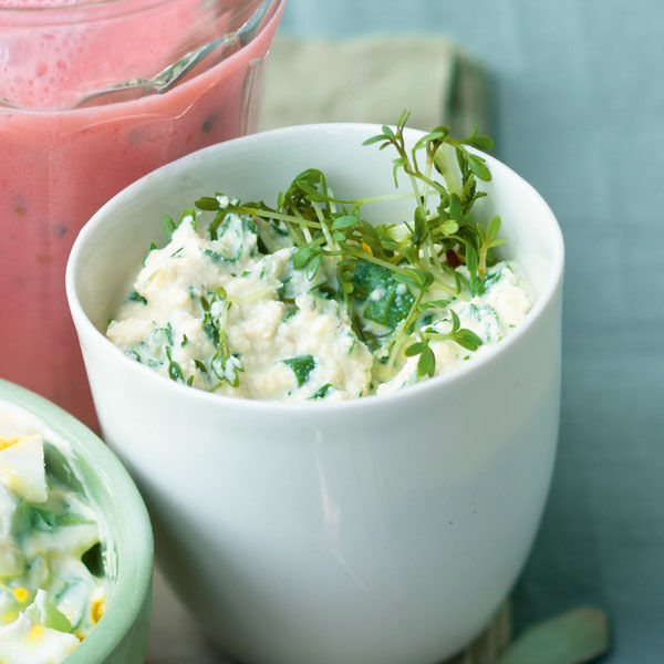 Den Tofu mit Küchenpapier trocken tupfen, zerbröckeln und mit 1 EL Zitronensaft, Öl, Sojasahne und Honig mit dem Stabmixer fein pürieren. Petersilie, Dill, Schnittlauch und die Hälfte der Kresse untermischen, mit Salz, Pfeffer und eventuell etwas mehr Zitronensaft würzen. Mit übriger Kresse bestreuen.