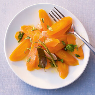Die Zucchini waschen, putzen und auf der Gemüsereibe grob raspeln. Knoblauch schälen und fein hacken. Mit Öl und Essig in einem kleinen Topf verrühren, erhitzen und zu den Zucchini geben. Minze und Basilikum untermischen.