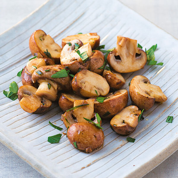 Öl in einer großen Pfanne erhitzen, Zwiebel und Champignons darin 3-4 Min. anbraten. Rosmarin, Thymian und Knoblauch dazugeben und 2 Min. weiterbraten. Mit Essig ablöschen und mit Salz und Pfeffer würzen. Die Petersilie untermischen und warm oder kalt servieren.