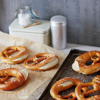 Ofen auf 180° vorheizen. Teig kneten und in acht Stücke teilen. Aus jedem Stück einen Fladen von 12 cm Ø ausrollen. Den Rand etwas dicker formen. Zwiebel-Kräuter-Creme aufstreichen. Fladen im Ofen (Mitte, Umluft 160°) 25 Min. backen. Mit 75 g Butter in Flöckchen belegen und heiß servieren.