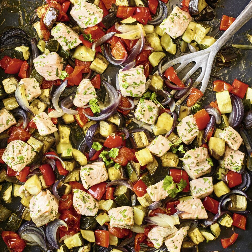 Die Kombination aus Lachs und Ratatouille schmeckt einfach hervorragend. Beides kann ganz einfach auf einem Blech zubereitet werden.
