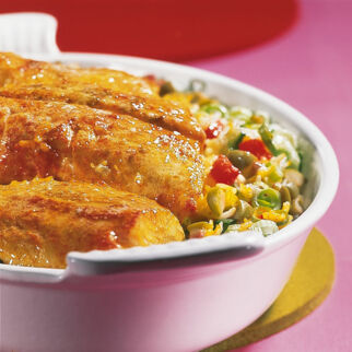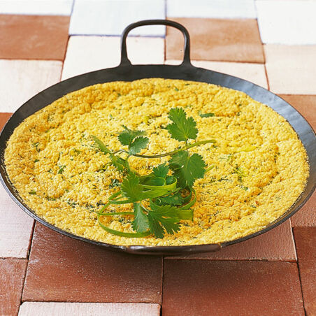 Backofen auf 180° vorheizen. Zwiebeln waschen, putzen und in Ringe schneiden. Eier trennen, Eiweiße steif schlagen. Eigelbe gut verquirlen. Kräuter waschen, hacken, mit den Gewürzen unter die Eigelbe rühren, salzen und pfeffern. Eischnee unterheben.