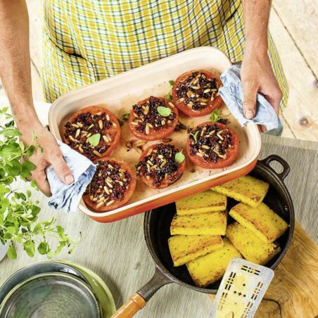 Tomaten salzen und mit der Olivenmischung bestreuen, zum Schluss das Olivenöl darüberlaufen lassen. Tomaten im Ofen (Mitte) 30 - 35 Minuten backen, bis die Oberfläche schön gebräunt ist.