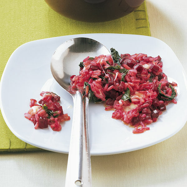 Ein ungewöhnliches Rezept, in dem der Reis durch die rote Beete eine rosa Farbe erhält. Das Auge isst mit!