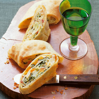 Für den Nudelteig 300 g Mehl mit Eiern, Öl, Essig und 1/2 TL Salz zu einem glatten geschmeidigen Teig verkneten. Teig zur Kugel formen, in Frischhaltefolie wickeln und 30 Min. ruhen lassen.