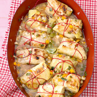 Jeweils 2 Kohlblätter ineinander legen, 1 EL Pilz-Reis-Mischung darauf geben, die Seiten zusammenlegen und die Blätter aufrollen. Die Krautwickel mit Küchengarn zusammenbinden.