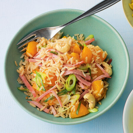 Ausgequollenen Reis mit Sojasauce und 1 Prise Zimt abschmecken. Mit Aprikosenstücken, Zwiebelringen, Schinkenstreifen und Cashew-Kernen vermischt auf dem Backblech verteilen. Das übrige Öl über dem Reis verteilen und alles 5 Min. im Backofen überbacken.