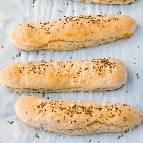 Eine ofenfeste Schale mit Wasser auf den Backofenboden stellen und den Ofen auf 180° (Umluft 160°) vorheizen. Die Teigstangen mit Wasser bestreichen und mit Kümmel und Salz bestreuen. Im Ofen (Mitte) in ca. 25 Min. hellbraun backen.