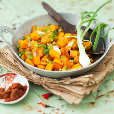 Das orangefarbene (Hokkaido-Kürbis), gelbe (Ananas) und weiß-grüne (Lauchzwiebeln) Pfannengericht bekommt durch Ingwer seine sanfte Schärfe.