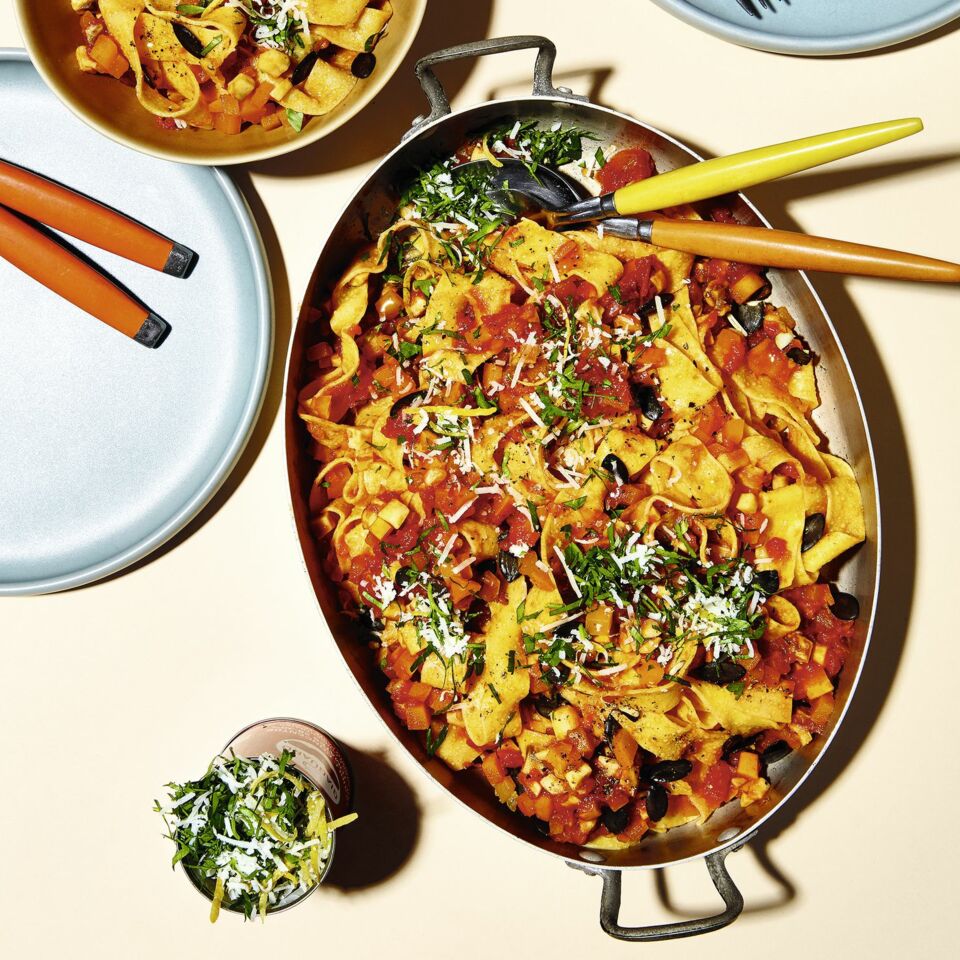 Farbenfrohe Veggie-Pasta: Statt Hackfleisch haben in dieser Bolo Kürbis und Champignons ihren großen Auftritt. Unbedingt ausprobieren!