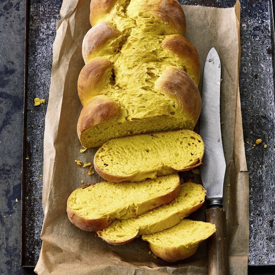 Den Backofen auf 180° vorheizen, ein Blech mit Backpapier belegen. Den Hefeteig dritteln und jedes Teil auf der mit Mehl bestäubten Arbeitsfläche zu einem ca. 25 cm langen Strang formen. Die Stränge zu einem Zopf flechten und auf das Blech legen. Den Kürbis-Hefezopf im Backofen (Mitte) in ca. 25 Min. hellbraun backen. Herausnehmen, auf einem Kuchengitter abkühlen lassen und in 16 Scheiben schneiden.