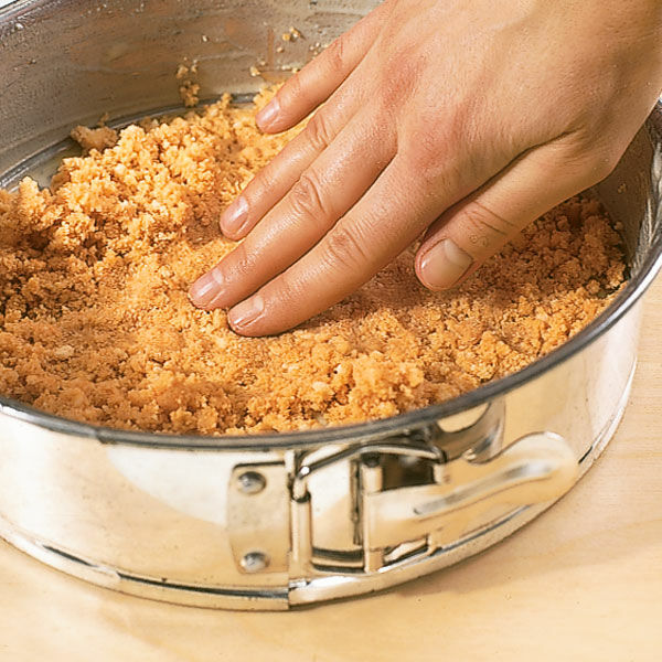 Für den Teig die Löffelbiskuits in eine Plastiktüte geben und mit dem Teigroller zu feinen Bröseln (Step 1) zerdrücken. In eine Schüssel geben und mit der Butter verkneten. Die Springform einfetten. Den Krümelteig in die Form geben und auf dem Boden glatt drücken (Step 2). Den Backofen auf 175° vorheizen.