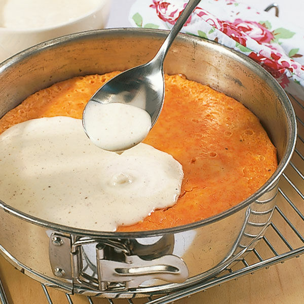 Für die Glasur die saure Sahne mit dem Zucker und dem Vanillezucker verrühren und über den heißen Kuchen geben (Step 3). Den Kuchen in weiteren 15 Min. fertig backen.