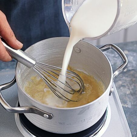 Inzwischen für die Béchamelsauce die Butter in einem Topf erhitzen, Mehl darin kurz andünsten. Mit Salz, Pfeffer und Muskat würzen. Milch und übrige Brühe einrühren, aufkochen und bei mittlerer Hitze unter Rühren 15 Min. kochen.